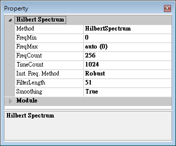 | Method | 選擇 Hilbert Spectrum 計算的方法,"HilbertSpectrum"使用傳統的 Hilbert Transform;"byEnvelope"為逸奇科技自行開發之方法。 | HilbertSpectrum |