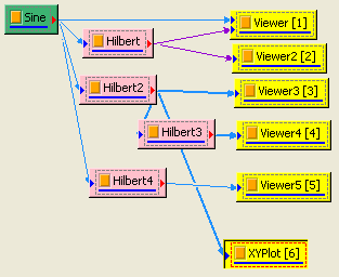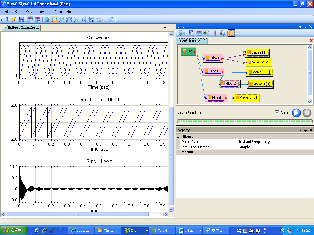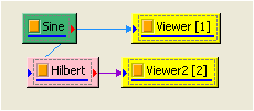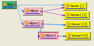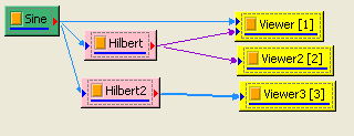 先用 Source / Sine Wave 產生 sine wave,用 Viewer / ChannelViewer 繪出訊號,再於 Sine 圖示點選 Compute / Transform / Hilbert Transform 直接作計算,Output Type 預設為 Complex,用 Viewer / Channel Viewer 繪出結果。(須注意輸出訊號是複數,而 Channel Viewer 的 Properties / YValueType 預設是 Magnitude,因此在 Viewer 上畫的是輸出訊號的 Magnitude )。