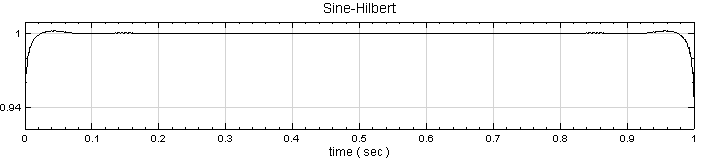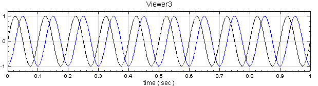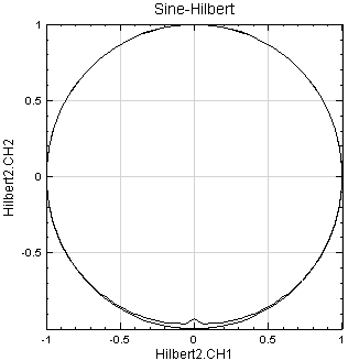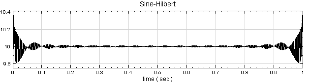 範例 I :用 Source 模組產生一個 sine wave 訊號,直接作 Hilbert Transform,並藉調整 Hilbert transform 的 Output Type 以瞭解各參數項之意義。