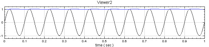 對訊號源 Sine 再作一次 Hilbert Transform,將 Properties 內 Hilbert / Output Type調整為 Split Complex,這樣 Hilbert Transform 會把實、虛部分為兩個通道,用 Viewer / Channel Viewer 即繪出實部與虛部的值,其中黑線為實部,藍線為虛部。