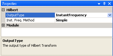 重覆步驟 2 的作法,僅改變 Output Type 為 InstantFrequency,圖示名稱也改為 Instant Frequency,結果為輸入訊號在每個時間點上的瞬間頻率。