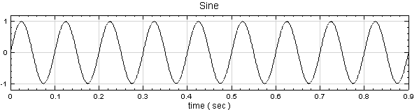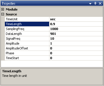 於 Network 視窗新增 Source / Sine 創造 sine wave,於 Properties 視窗調整 TimeLength 欄位為 0.9 sec。