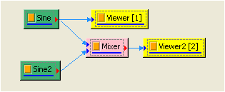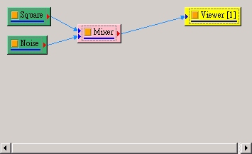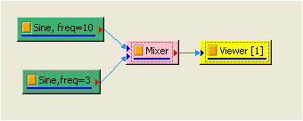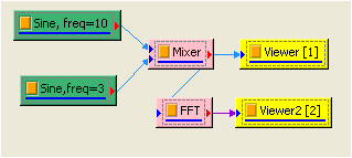 如上面步驟新增一 Signal frequency 為 3,TimeLength 為 0.9 sec 的 sine wave,再新增 Compute / Math / Mixer 將兩訊號相加,並用 Viewer / ChannelViewer 繪出。