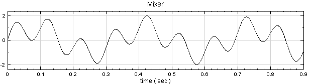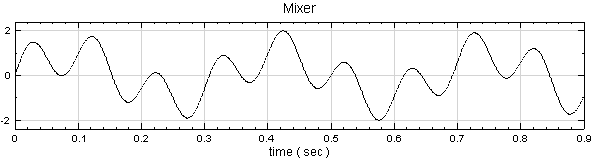 再新增一 sine wave,並設定 Signal fnequency 為 3,TimeLength 為 0.9sec 的 sine wave,再新增 Compute / Math / Mixer 模組將兩訊號相加,並用 View / Channel Viewer繪出。