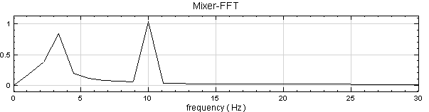 經傅立葉轉換產生的頻譜圖,可辨視主要之頻率在 10Hz 與 3Hz 處,不過 3Hz 附近的 Magnitude 被低估,可能與訊號頻率過低有關,現在調整 Resolution 來改善頻譜。於 Project 1 點選 FFT 圖示,設定 Properties / Resolution 等於 5,結果如下: