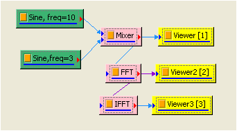 本範例(Example)運用 Source 模組產生頻率 10,TimeLength 為 0.9sec 的 sinewave,與頻率 3;TimeLength 為 0.9 的 sine wave 相加的訊號,先以 Fourier Transform 計算出訊號之頻譜,調整 Resolution 與 Window 提高頻譜的辨視度,再將頻譜以 IFFT 反轉換計算出原來的訊號。