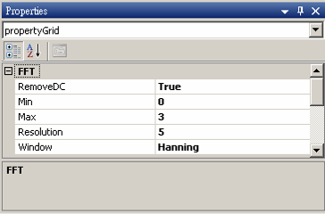 參數 RemoveDC 計算出訊號的平均值並減去,參數 Min 與 Max 可調整作傅立葉轉換的頻率範圍,Window 參數內有六種常用的窗函數,目的是將離散訊號變的較為平滑並改善因 Spectral Leakage 而造成的數值誤差。