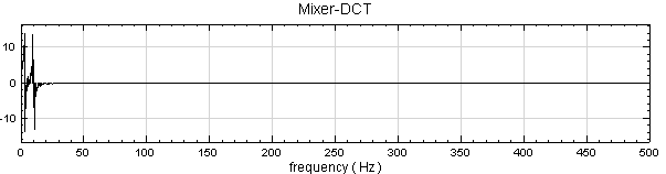 對 Mixer 後的訊號作 Compute / Transform / Discrete Cosine Transform,並將結果用 Channel Viewer 繪出。圖上訊號頻譜集中在低頻處。