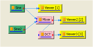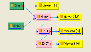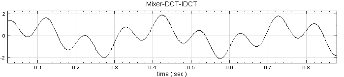 本範例(Example)運用 Source 產生頻率 10、TimeLength 為 0.9 sec 的 sine wave 與頻率為 3Hz,TimeLength 為 0.9sec 的 sine wave 相加的訊號。先以 DCT 計算出訊號之頻譜,再將頻譜以 Inverse DCT 計算出原來的訊號。