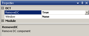 本模組接受實數(real number),單通道(single channel)或多通道(multi-channel),regular的訊號(signal)、聲音訊號(audio)輸入;輸出格式為實數,單通道,regular的訊號(signal)。離散餘弦轉換其參數設定如下,反轉換則無設定參數。