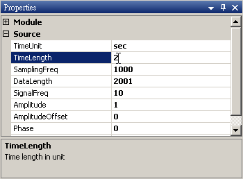 於 Network 視窗新增 Source / Sine 創造 sine wave,於 Properties 視窗 Name 欄位修改名稱為 Sine,freq=10,Signal frequency 預設即為 10 Hz,調整 TimeLength 欄位為 0.9sec。