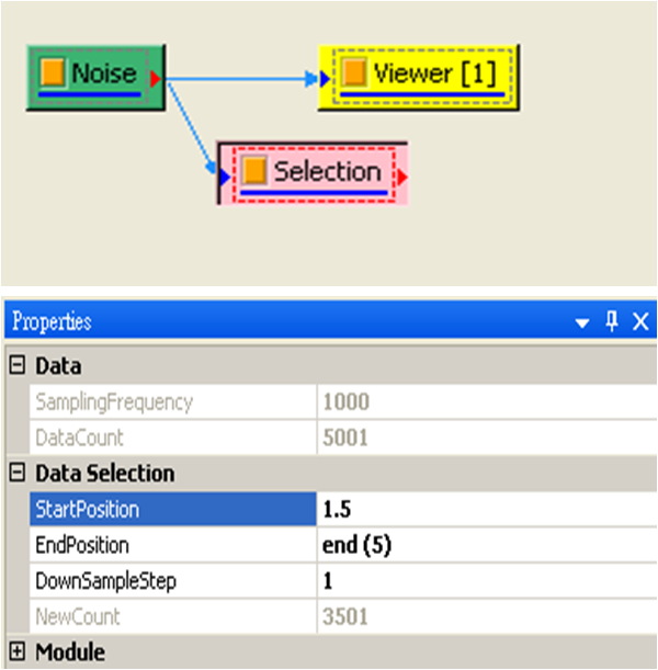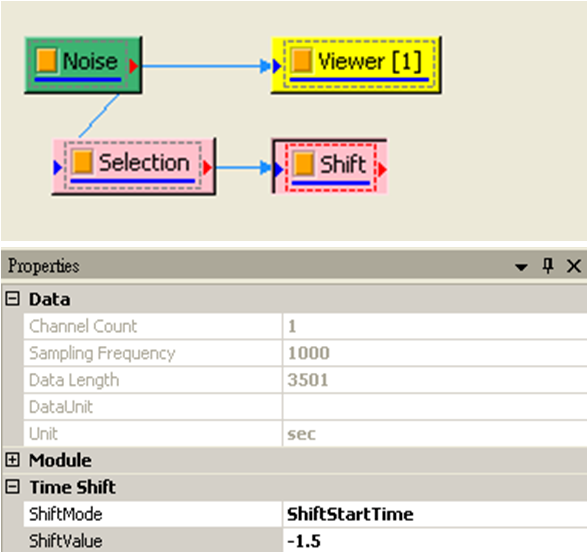 點選 Noise,按右鍵選擇 Compute / Channel / Data Selection,於 Properties / EndPosition欄改為 3.5,然後接著連上 Compute / Channel / Time Shift,Properties / Shift Value 設為 -1.5,目的為將原訊號 0 ~ 3.5 秒的資料移至新訊號 1.5 ~ 5 秒處。