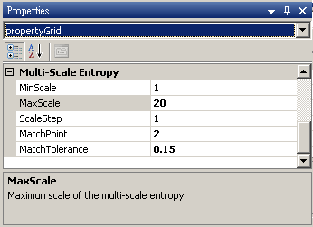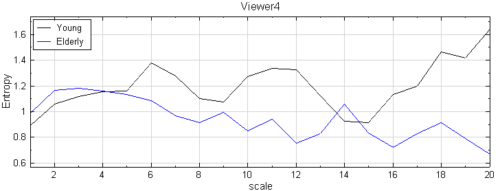 最後將兩速度訊號經過 Compute / Transform / MSE 計算,利用 Viewer / Channel Viewer 觀察結果,發現年長者平衡感較差,COP 之改變較無彈性,是故熵隨尺度變大而衰減;而年輕人平衡感好,COP 移動靈活,熵幾不隨尺度而改變。