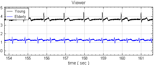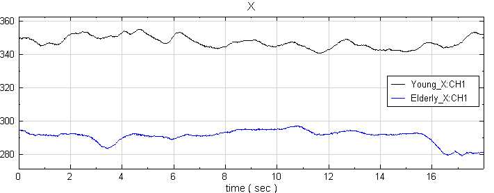 於Project 視窗下,載入兩筆資料,分別為年輕人及老年人站立時的 Center of Pressure (COP),在 X 方向隨時間的變化,利用 Viewer / Channel Viewer 觀察結果。