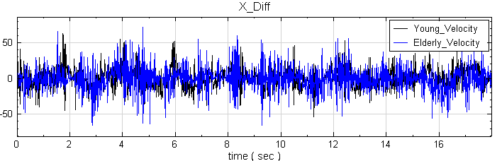 為了解保持身體平衡的能力,再將其原始訊號經過微分,得到 COP 的速度變化,如下圖。