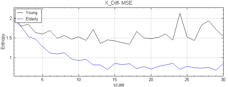 分別將兩個人的 ECG 分別計算出兩心跳間的時距,即所謂的 RRinterval ,最後利用 MSE 計算,其結果如下圖。並可以解釋年輕人的 ECG 與中年人的 ECG 作比較,年輕人的訊號複雜度較中年人來的高,年輕人心臟比較能應付外在各種變化,並進行調節心臟跳動。