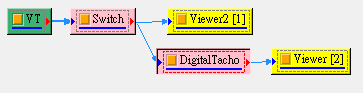首先將原始訊號經過 Channel Switch,選擇 Tachometer 訊號再以 DigitalTacho 計算實際轉速,最後以 Channel Viewer 觀察轉速大約在 5000RPM 左右,如下圖。