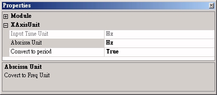 訊號資料讀取進來之後,常會碰到需要轉換時間單位的狀況,過去可能必須重新輸入訊號檔,再設定時間,現在可以利用 ChangeX-Axis Unit 直接換算時間。除轉換時間單位外,本模組最特別處,可將以頻譜的橫座標 ( X-Axis ) 由頻率進行轉換成各種週期單位。