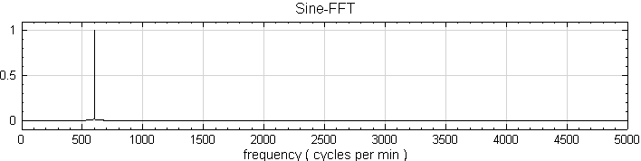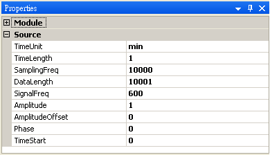 用 Source / Sine Wave 產生一正弦波訊號,預設訊號之訊號頻率為 10Hz,取樣頻率為 1000Hz,長度一秒。現在先改變 Sine 的參數值,Properties / TimeUnit 變為 min 分鐘,SamplingFreq 調整為 10000,SignalFreq 調整為 600,得到一組 X 軸單位為分鐘,而訊號頻率仍維持 10Hz 的訊號。
