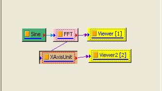 在此例中,FFT 的橫座標為 cycles per minute,現將 FFT 輸出接上 Change X AxisUnit,在Properties/ Abscissa unit 調為 Hz,然後再以 Channel Viewer 繪出。可看到 X 軸已變更以Hz 為單位。