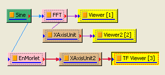 時頻分析的結果輸出至 Change X Axis Unit 能更改時間軸單位,並且也改變頻率的單位 ( 時頻圖的頻率在 Y 軸 )。回到訊號源 Sine,以Compute / TFA / Enhanced Morlet Transform做時頻分析後再接上 Change X axis Unit,調整 Properties /Abscissa unit 為毫秒 (msec),再用 Viewer / Time-Frequency Viewer 繪出,可看到時頻軸圖上的 X 軸(時間域)變成 msec,Y 軸(頻率軸)已變更為 KHz,即為 1 / msec。