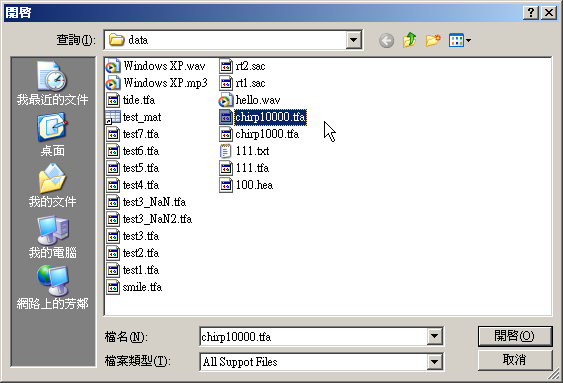 from file 讀取訊號檔,檔案 chirp1000.tfa 位在安裝目錄下 data 資料夾 ( 預設為 C : \
