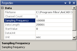 於 Properties 下可以看到此訊號的 SampleFreq 為 10000,Datalength 等於 20001,Unit 是 sec,所以此訊號長度等於 20000 / 10000 = 2 秒。
