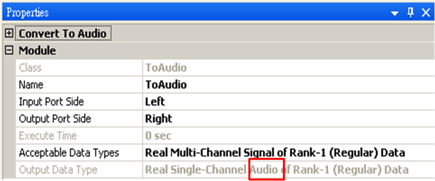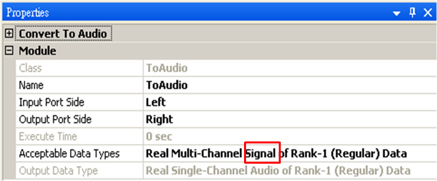 另外打開 Properties 下的 Module 類別,項目 OutputDataType 有說明此模組輸出之訊號格式與類型,這部份可參考第一章關於 Properties 的說明。此項目內容為 Real Single-Channel Signal of Rank-1(regular) Data,因此 Chirp10000 之資料類別是 Signal。