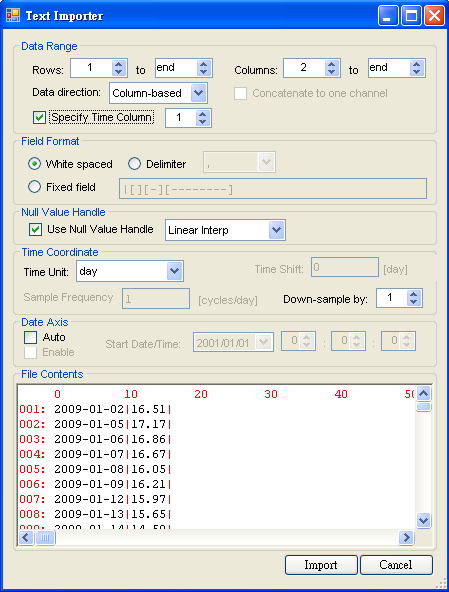 最後要將日期資訊取代現有的時間軸,將 regular 訊號轉成 Indexed 訊號,利用 Text Importer 再開啟 CSV 檔案,Data Range / Specify Time Column 為 Checked,和 Columns: 2 to end,讀取進來訊號屬於 Indexed,時間單位為 day。