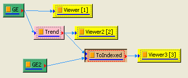 最後將 Trend 運算結果連接 Conversion / Convert to Indexed,接下來將第二次讀取進來的 Source (GE2) 也連接至 Convert to Indexed,最後將 Convert to Indexed 連至 Viewer / Channel Viewer 展示,可以看見有日期的資訊出現在 X 軸。