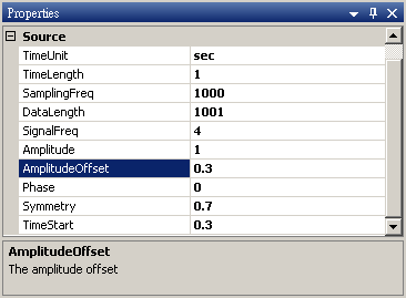 可將 AmplitudeOffSet 設為 0.3,再設定 TimeStart 為 0.3,SignalFreq 設為 4,Symmetry 設為 0.7,可得下列圖形: