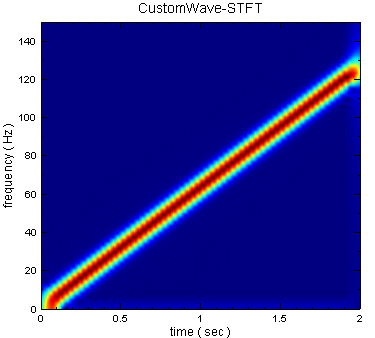 接下圖可用 short-term fourier transform 「驗證」其頻率正比於時間,配置與時頻圖如下,可見,頻率確實正比於時間。