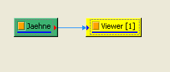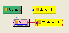 再將 Jaehne 接至 Compute / TFA / Short Term Fourier Transform 運算,最後以 Viewer / Time-Frequency Viewer 顯示結果,Jaehne 訊號類似 Chirp 訊號,隨著時間增加,訊號頻率增加。