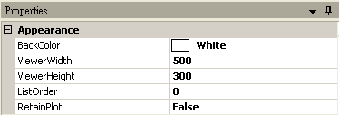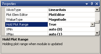 使用者利用縮小放大工具( Zoom X / Zoom Y )或平移工具( Pan X / Pan Y )檢視圖形時,若希望維持目前的檢視狀態,可以調整 Properties 下的 HoldPlotRange 功能鍵。將 Properties / HoldPlotRange 調整為 True。