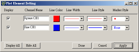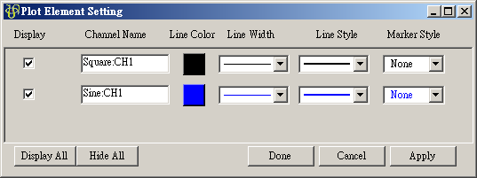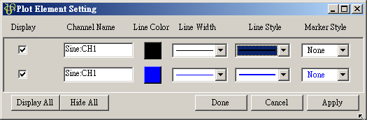PlotElemEditor 點選後會出現一視窗供使用者編輯繪圖樣式。使用者可調整線條的顏色、線寬、實線、虛線、更改 Channel 名稱,以及是否要加 Marker 等,也可以在 Display 勾選欄位下選擇是否要用線條繪出該 Channel 的訊號。