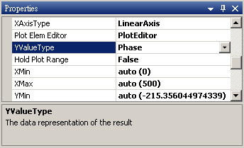 此頻譜圖的 X 軸為頻率,Y軸的 YValueType 預設為 Magnitude,將 YValueType 改變為 Phase,此時 Y 軸代表的是每個頻率的相位。
