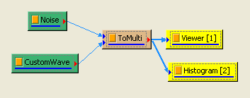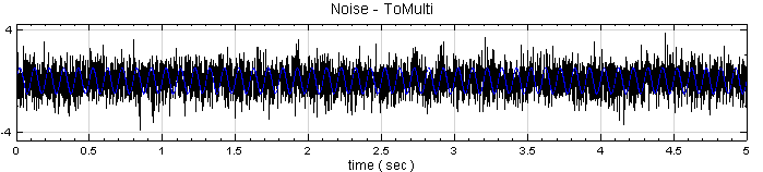 在Source / Noise 建立一個雜訊,調整 Properties / NoiseType 為 Gaussion;調整 Properties / Source / TimeLength 為 5。另外在 Source / Custom Wave 建立一個 Custom Wave,從 Properties /Source/ TimeLength 調整時間長度為 5 秒。以 Conversion / Merge To Multi-Channel 將兩組訊號合成一多通道訊號,再用 Viewer / Channel Viewer 將圖繪製出來。