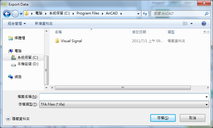 TFA Files 也是純文字檔,但在文件中多了檔頭 ( header ) 的設計,讓 Visual Signal 在讀入此類型檔案時可以更快速。 標頭中記載了包括資料類型、資料長度、取樣頻率..等資訊。