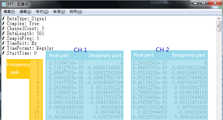 (1) 若是輸出頻譜資料(如 FFT 後的結果),由於是為複數資料,所以檔案中第一欄為頻率軸, 第二欄之後依序為第一通道的實部、第一通道的虛部、第二通道的實部、第二通道的虛部....以實部->虛部->實部->虛部的方式類推。如下圖所示: