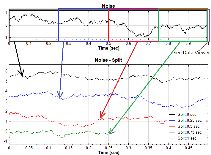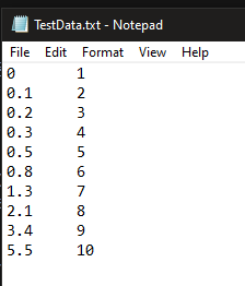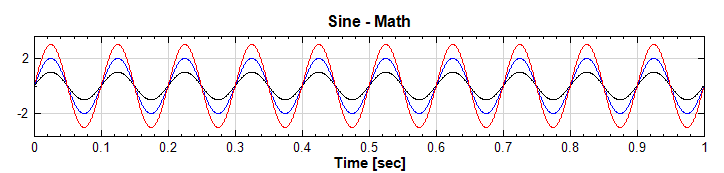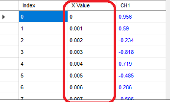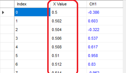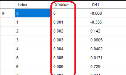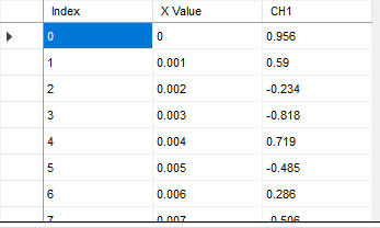 若儲存為 mat 檔,該檔內會有兩個變數,變數名稱會套用元件的名稱。以這個例子來說,會有 Sine_x 與 Sine_y;其中 Sine_x 儲存每個訊號資料所對應的時間, Sine_y 則儲存訊號資料,資料都是以 column 的方向儲存。若訊號有 n 個通道,則在 Sine_y 變數會以 column 的方式儲存,一個 column 代表一個 channel 的訊號資料。